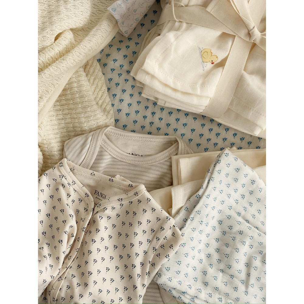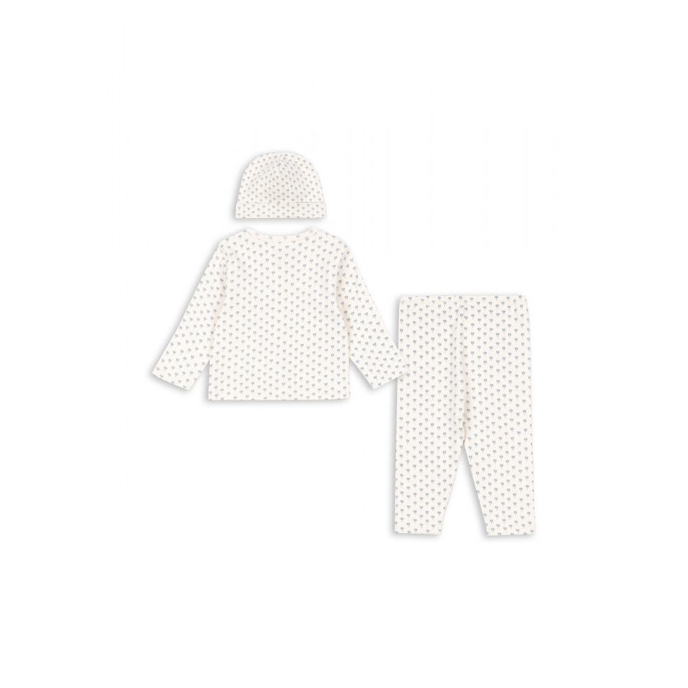 М'який комплект для новонароджених, що включає пару штанів з органічної бавовни, м'який топ, який повністю відкривається спереду на кнопках, та маленьку шапочку, яка зігріє малюків. Ці базові речі виготовлені з суміші органічної бавовни та модалу з еластаном для додаткової міцності та еластичності. Модал — це м'яке та дихаюче волокно, ніжне та м'яке як для нічного, так і для щоденного носіння.