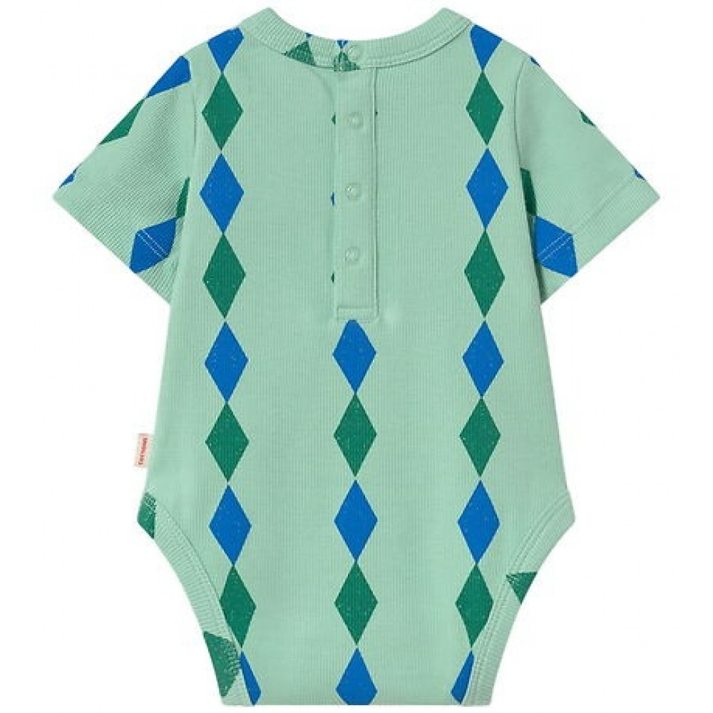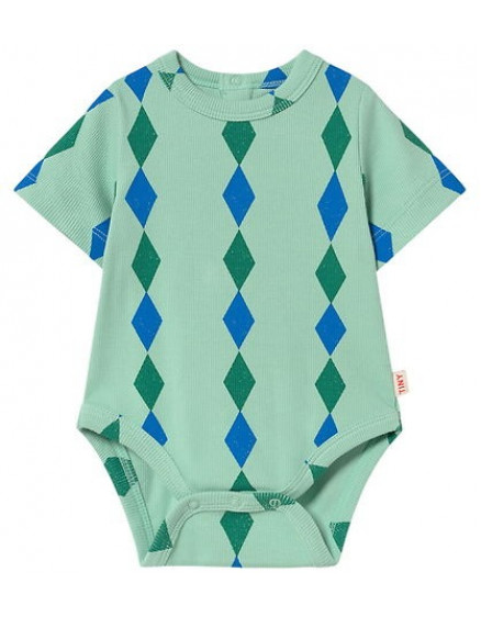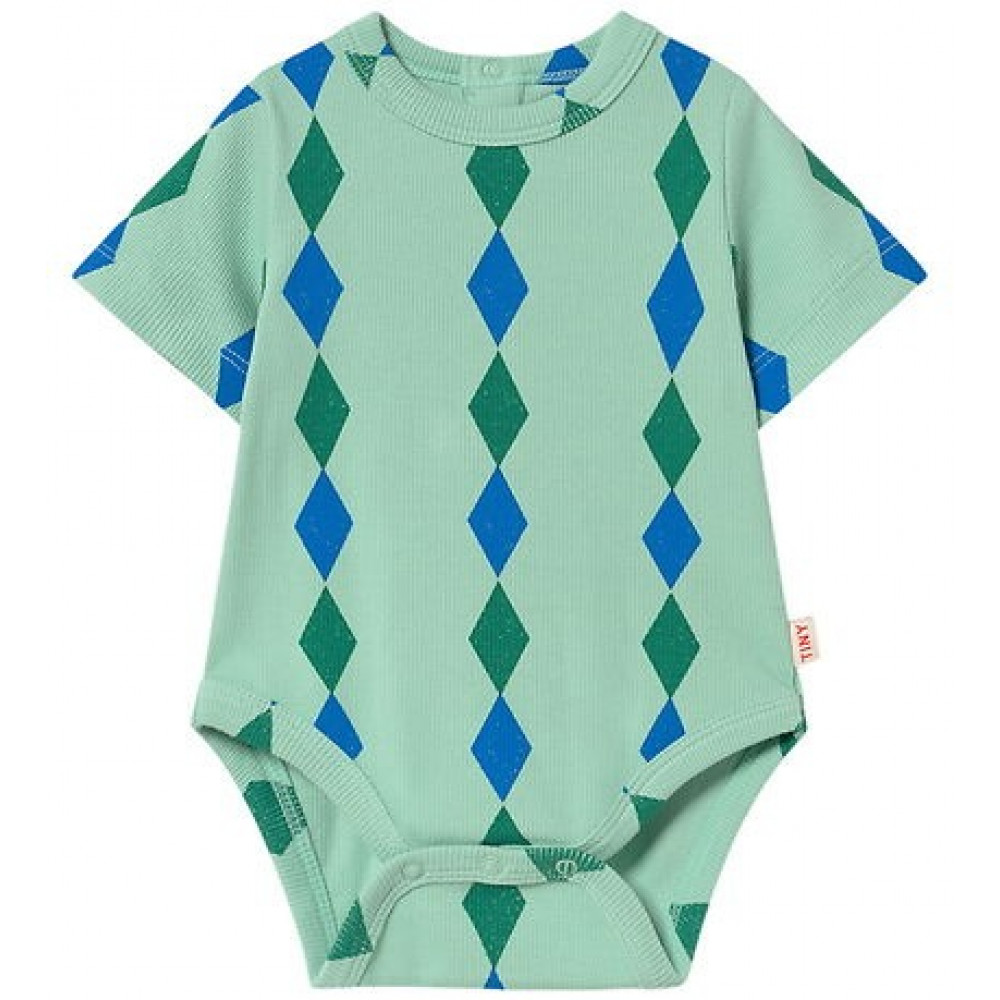 Цей боді з принтом діамантів у ребристу тканину виготовлений з м'якої бавовняної суміші, яка пропускає повітря. Він має зручний, вільний силует з короткими рукавами та застібкою на кнопці знизу.