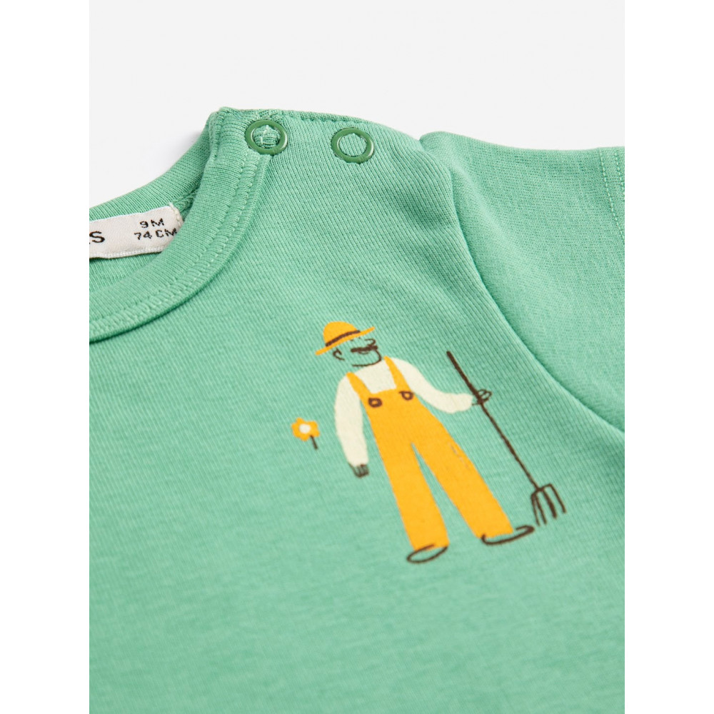 Зелений боді. Короткі рукави, застібка на кнопках на плечах, застібка на кнопках у промежині, приталений крій та круглий виріз горловини. Виготовлено в Іспанії.