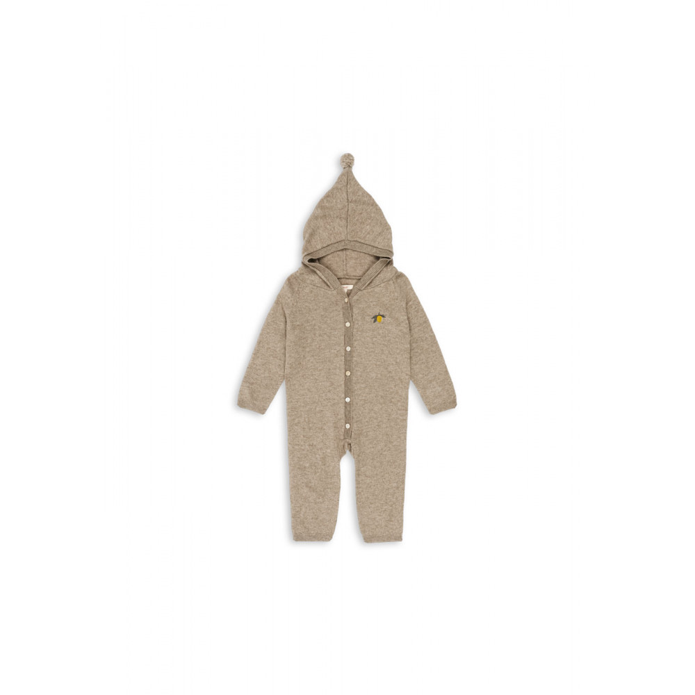 Надзвичайно теплий та м’який в’язаний комбінезон, ідеальний для дрімоти в колясці або як теплий додатковий шар одягу в дуже холодні дні. Виготовлений з дихаючої мериносової вовни з ребристими краями, м’якою толстовкою та перламутровими ґудзиками спереду.