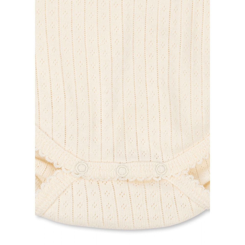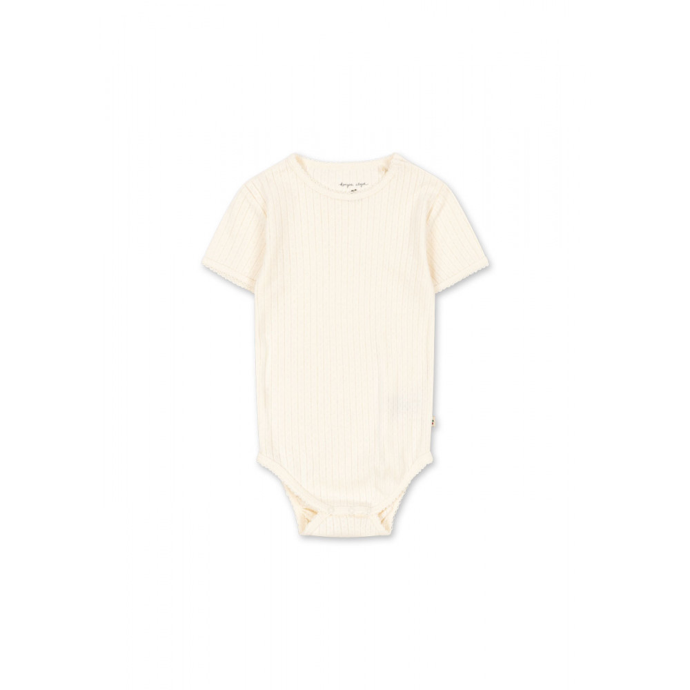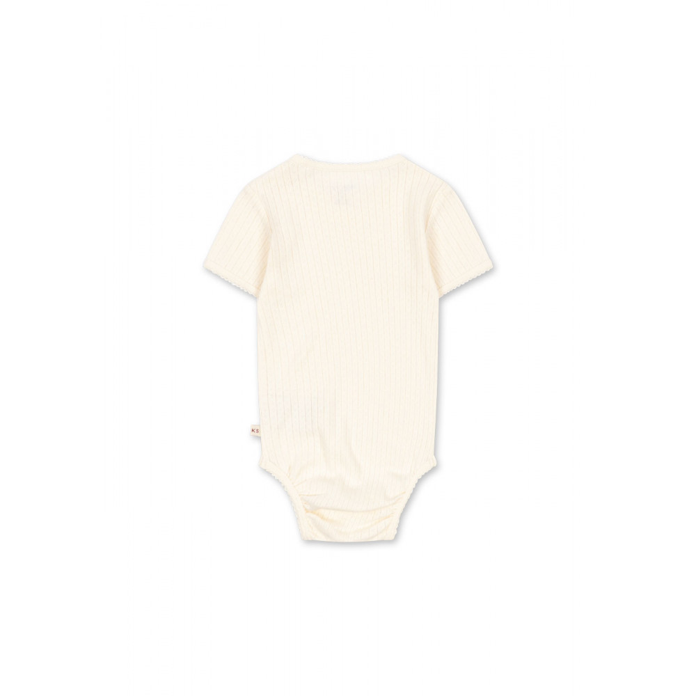 М'який боді з короткими рукавами. Виготовлений зі 100% органічної бавовни пуантель з декоративними краями піко. Розроблений з кнопками на промежині та плечах для легкого одягання та зміни підгузка.
