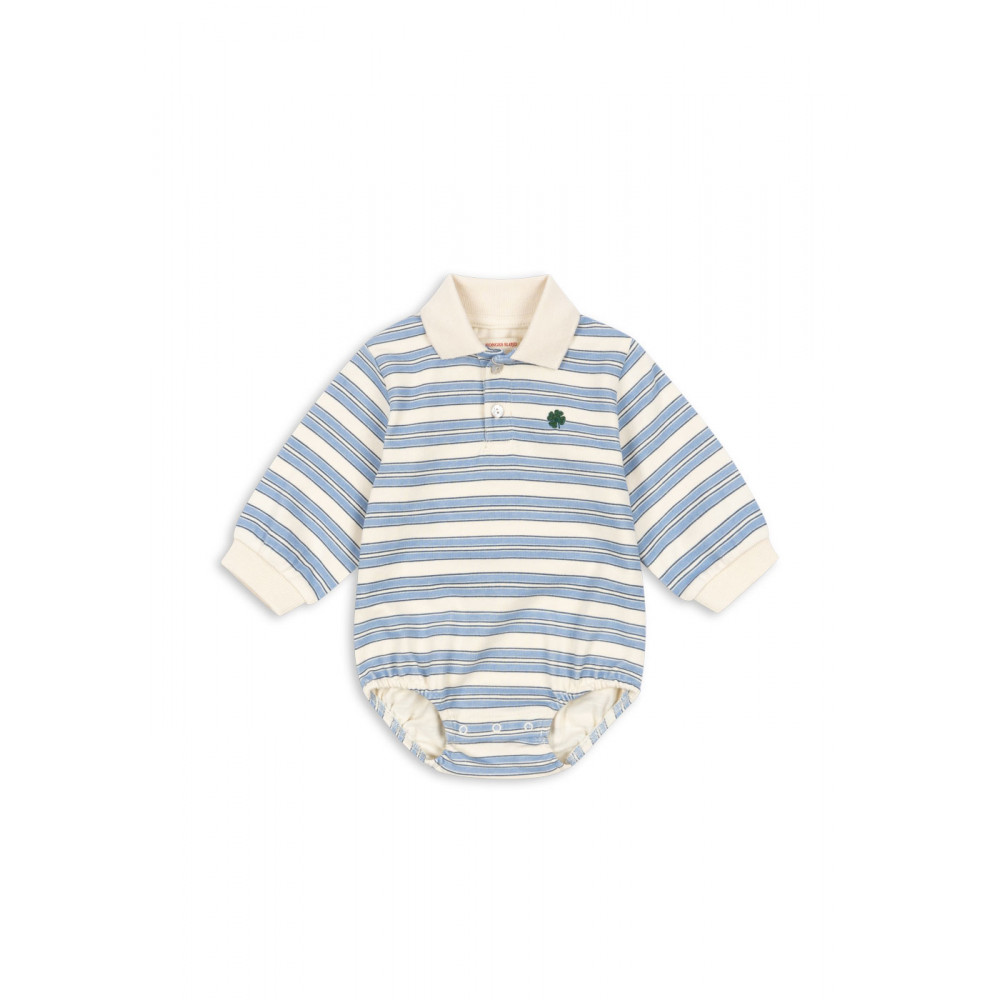 М'який ромпер з органічної бавовни в класичному дизайні поло. Має звичайний комір, планку на ґудзиках та застібку на ґудзики на штанинах для легкого одягання.