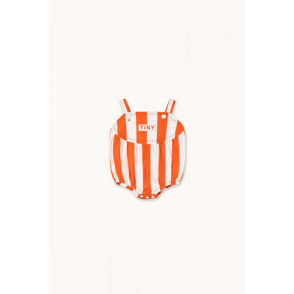 Цей дитячий боді з силуетом «кулька» з м’якої легкої саржі з білою основою прикрашений веселими літніми червоними смужками. Завдяки бретелям та зручній застібці на кнопки його легко одягати, а нижня застібка на кнопці забезпечує швидку та просту зміну підгузків. Милий та практичний дизайн, ідеально підходить для перших літніх днів.