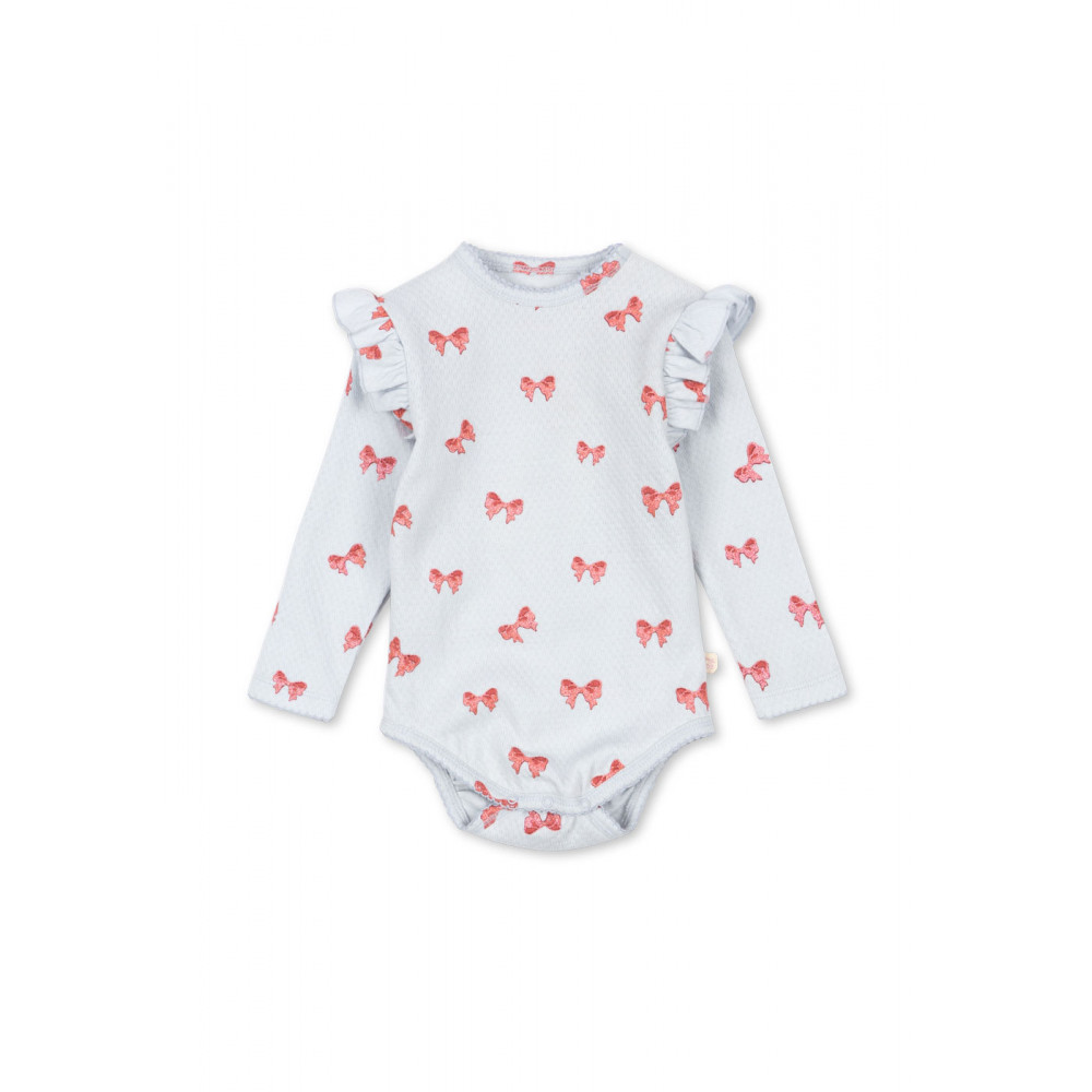 М'який бавовняний боді з рюшами на плечах. Застібка на ґудзики на штанині для легкого одягання.