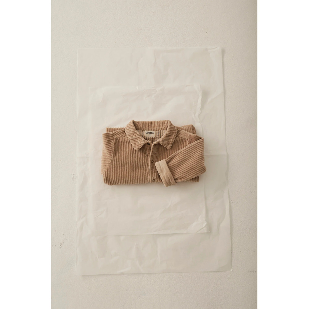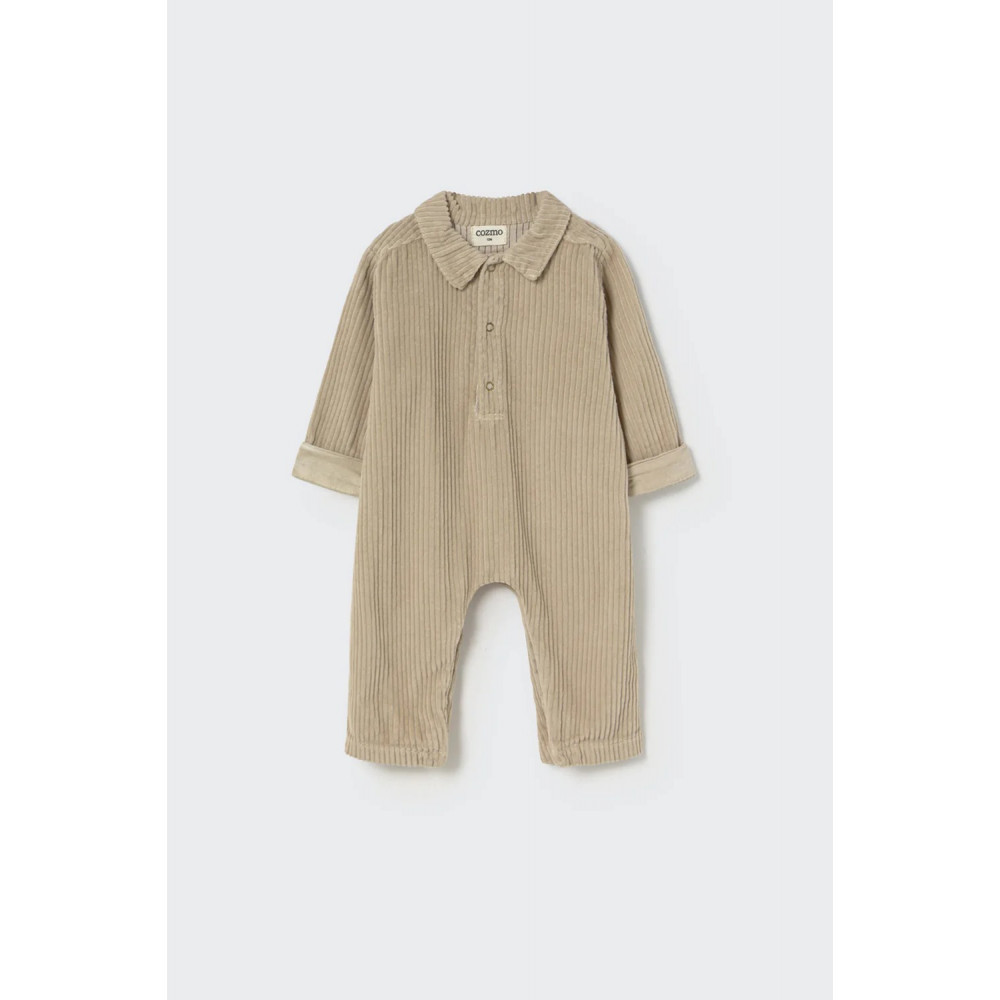 Надзвичайно м'який та затишний широкий вельветовий комбінезон, виготовлений з органічної бавовни, сертифікованої OCS та OEKO-TEX. Він має сорочковий комір, застібку на ґудзиках спереду та підкатані манжети. Ґудзики-кнопки проходять вздовж штанин для легкого одягання. Комбінезон має кокетку та накладні кишені ззаду з контрастними вельветовими деталями. Підкладка з фірмової тканини «Cozmo», ніжна на дотик та приємно облягає — ідеально підходить для немовлят. Забезпечує природну ізоляцію, щоб дитина була в теплі та затишку. Ніжна текстура, ідеально підходить для чутливої шкіри. Структурована, але гнучка для щільного та комфортного прилягання. Дбайливий до шкіри та планети. Екологічний вибір для гардеробу вашої дитини.
