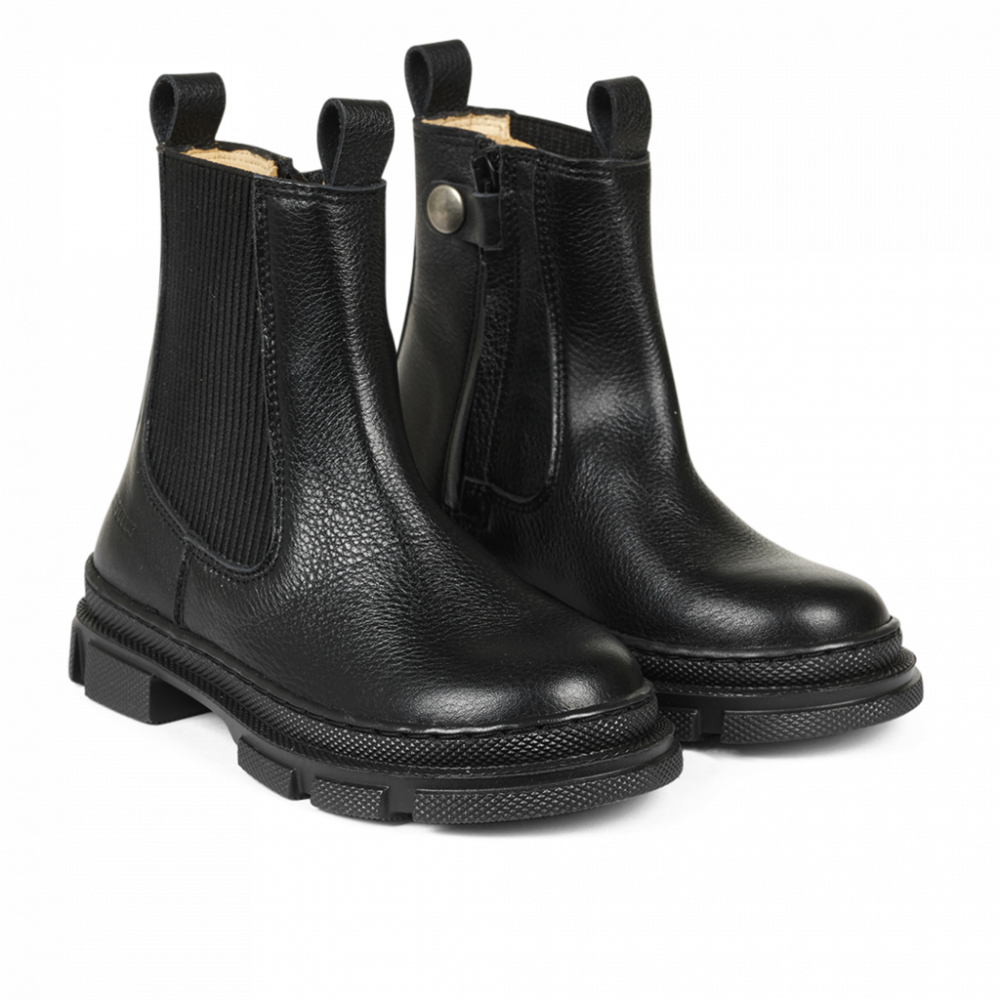 Масивні черевики челсі з чорною спортивною підошвою. Черевик має круглий носок, щільно прилягаюче халяву з ремінцем та чорну ребристу стрічку для легкого взування та знімання, гнучку чорну гумову спортивну підошву, яка піднімається над носком і п'ятою, тиснений логотип на п'яті, м'яку устілку, шкіряну підкладку та виготовлений з натуральної та дихаючої шкіри. Розроблено в Данії та виготовлено вручну з любов'ю в Португалії. Черевик відповідає розміру, але якщо у вас між двома розмірами, ми рекомендуємо вам обрати найбільший розмір.
