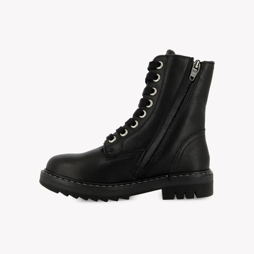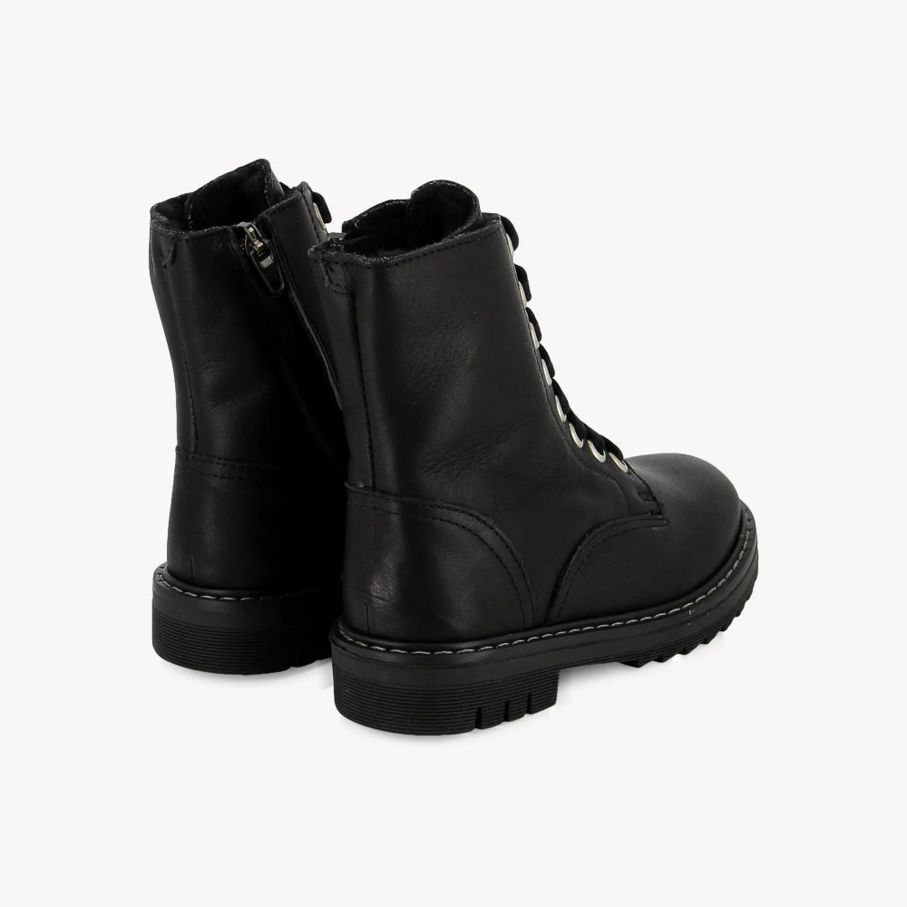 Ці гладенькі чорні шкіряні черевики до щиколотки натхненні стилем рейнджерів і мають шнурівку в поєднанні з внутрішньою блискавкою для легкого взування. Їхня нековзка підошва з виступами забезпечує чудове зчеплення. Синтетична підкладка забезпечує оптимальну ізоляцію від холоду, а шкіряна устілка гарантує комфортну посадку. Доступні тут з чорної шкіри, вони поєднують стиль, комфорт та довговічність.