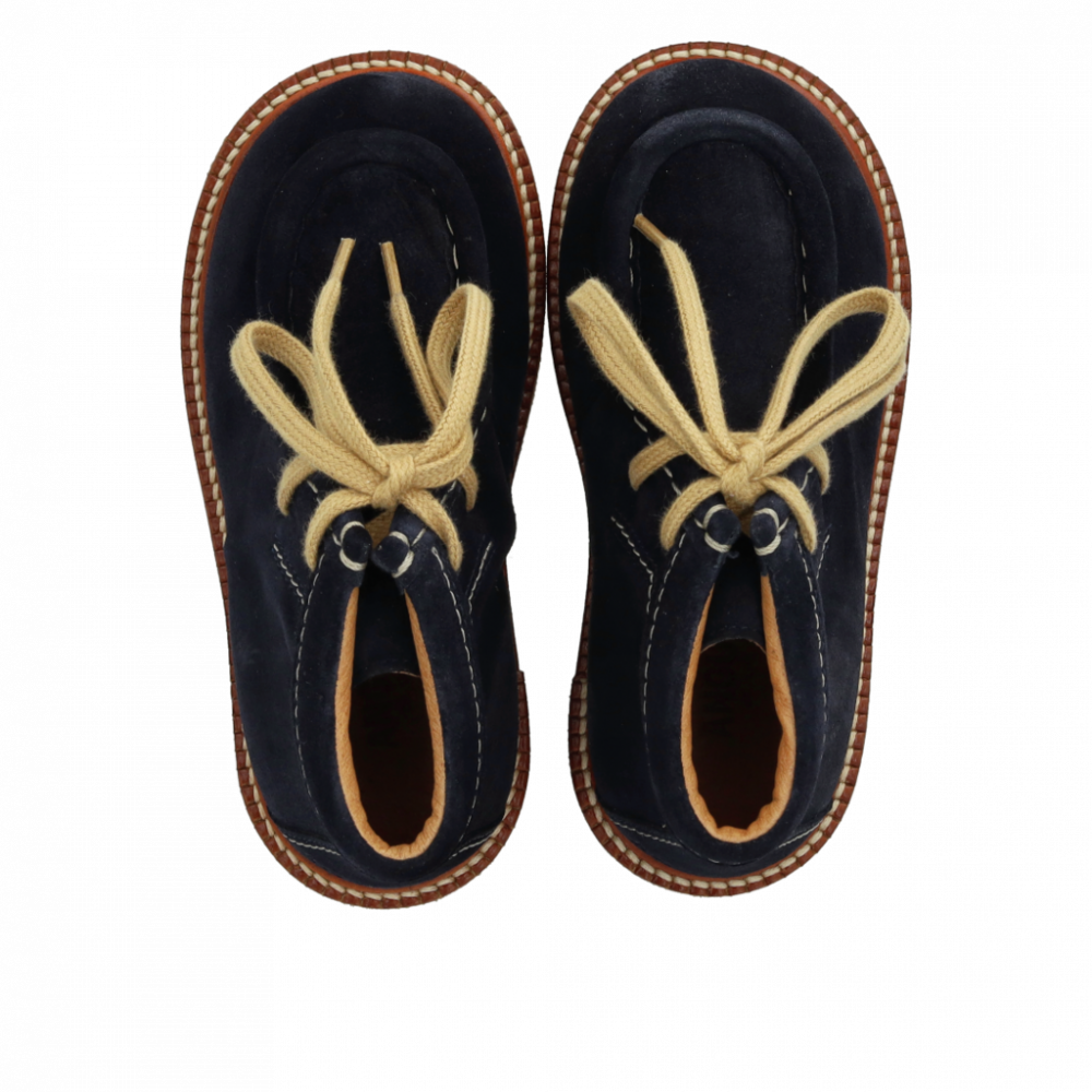 Замшеві туфлі з широким носком та декоративною строчкою. Взуття має бавовняні шнурки та легку, м'яку та гнучку крепову гумову підошву з відновлюваного натурального каучуку, вирізану для додаткової підтримки склепіння стопи. Взуття має м'яку устілку, підкладку зі шкіри без хрому та фіксовану п'яту для додаткового комфорту та підтримки. Виготовлено з натуральної та дихаючої шкіри. Розроблено в Данії та виготовлено вручну з любов'ю в Португалії. Завжди вимірюйте стопу вашої дитини перед покупкою, щоб переконатися, що ви обрали правильний розмір. Ми рекомендуємо припуск на зріст 1-1,2 см.