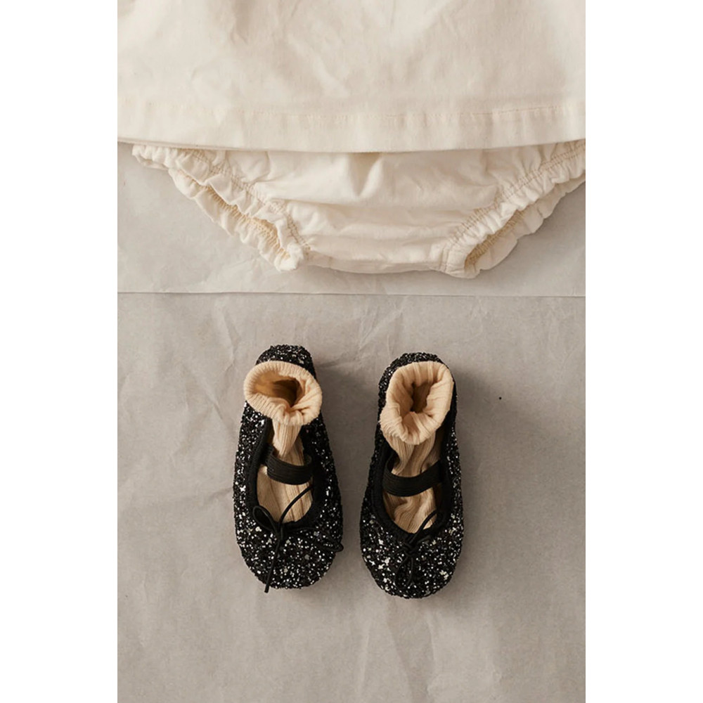 Виготовлені вручну в Іспанії для маленьких ніжок, ці дитячі балетки виготовлені з чорної тканини з ефектом сріблястого блиску. Гумка забезпечує надійну та комфортну посадку, поєднуючи традиційну майстерність з позачасовою елегантністю, ідеально підходить для перших кроків вашої дитини. 100% ручної роботи та місцевого виробництва з високоякісних матеріалів. Сертифіковано знаком майстерності Валенсії. Кожна пара зібрана та прошита вручну за допомогою традиційних вінтажних швейних машин. Підошва з натуральної телячої шкіри — міцна та гнучка.