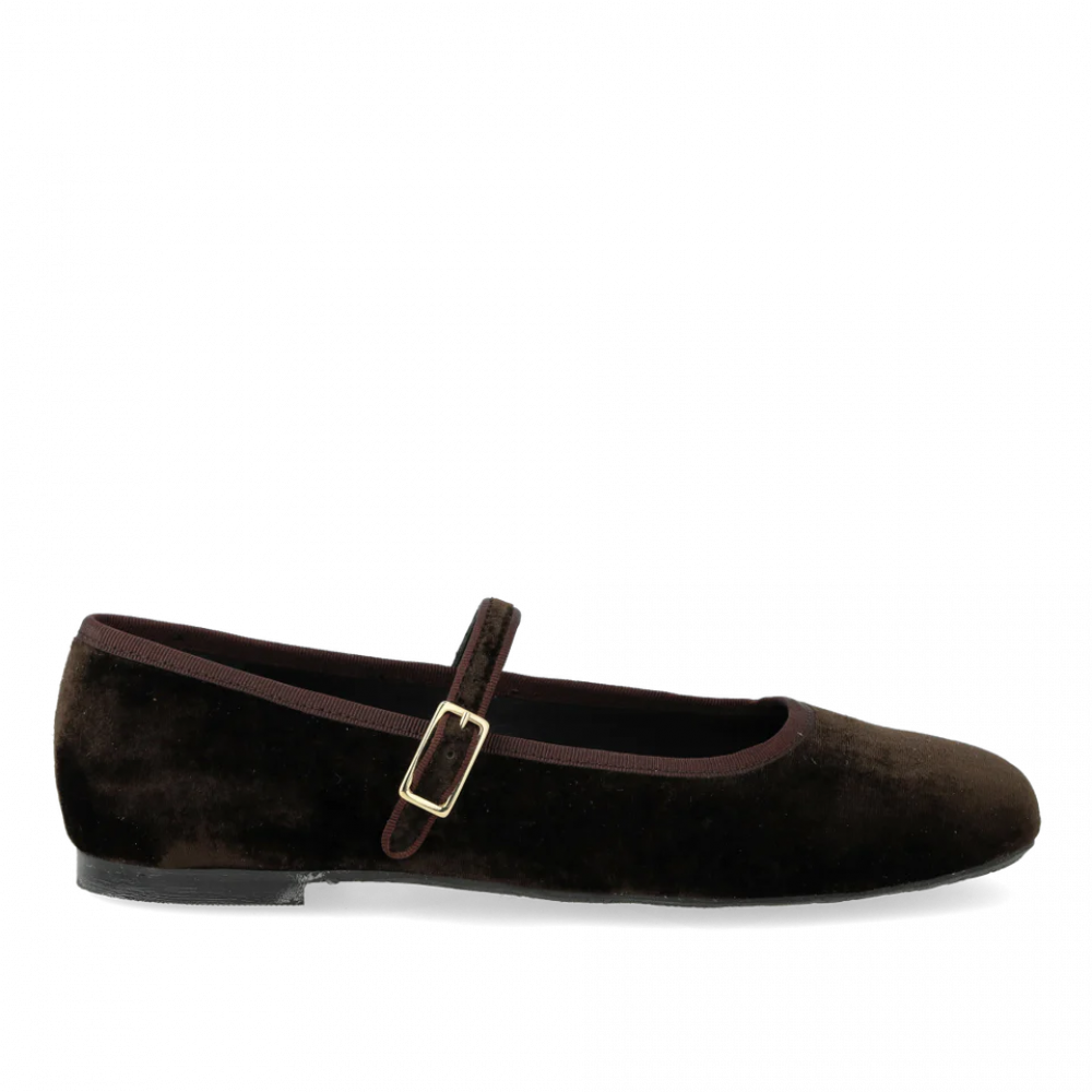 Балерини "Мері Джейн" з м'якого оксамиту з помірним квадратним носком. Балерина має регульовану застібку із золотою пряжкою, м'яку устілку, підкладку зі шкіри без хрому та легку, м'яку та гнучку гумову підошву ANGULUS. Розроблені в Данії та виготовлені вручну з любов'ю в Португалії.