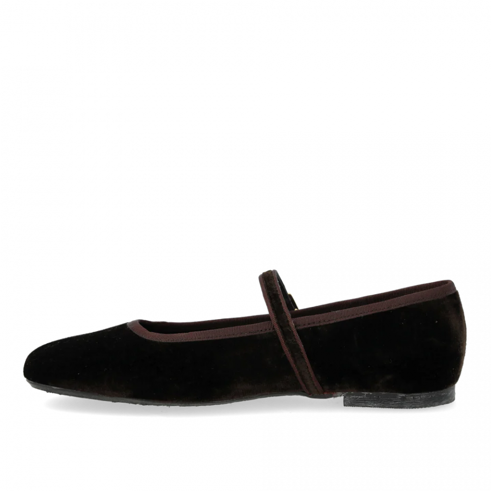 Балерини "Мері Джейн" з м'якого оксамиту з помірним квадратним носком. Балерина має регульовану застібку із золотою пряжкою, м'яку устілку, підкладку зі шкіри без хрому та легку, м'яку та гнучку гумову підошву ANGULUS. Розроблені в Данії та виготовлені вручну з любов'ю в Португалії.