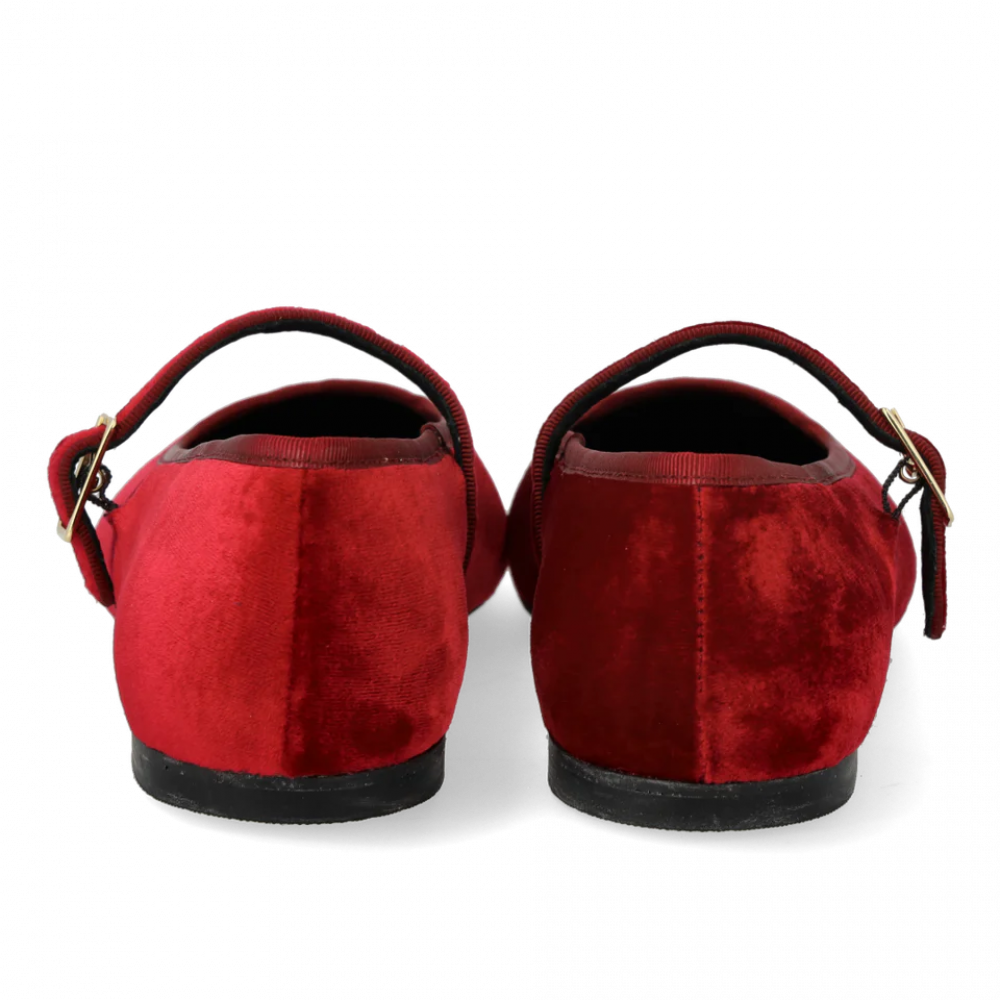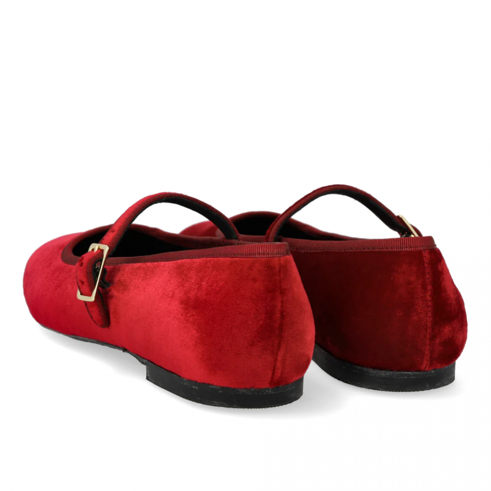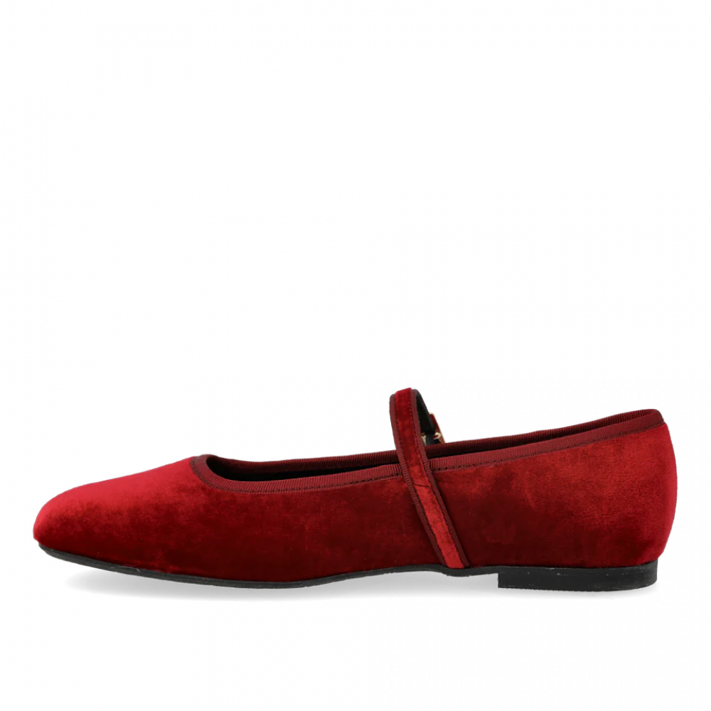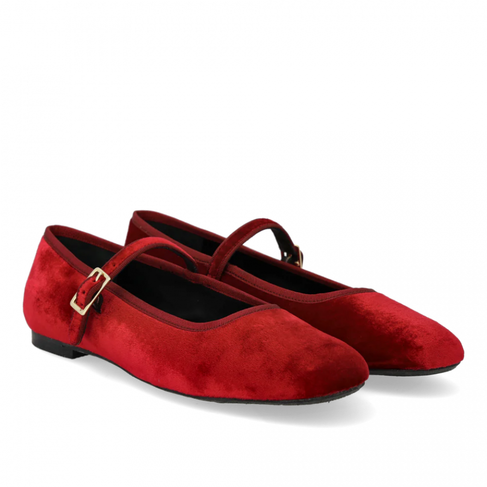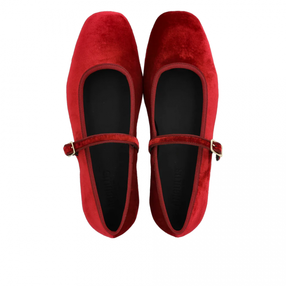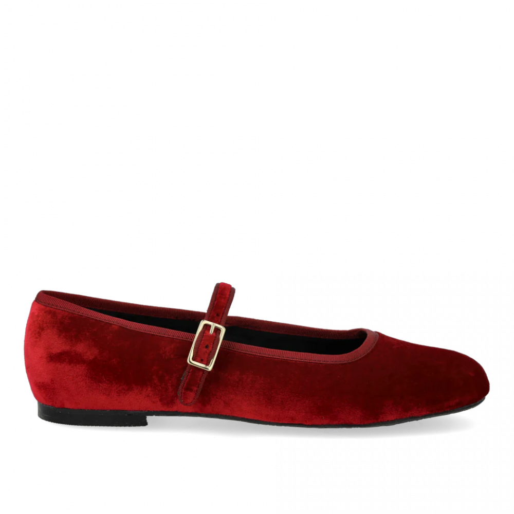 Балерини "Мері Джейн" з м'якого оксамиту з помірним квадратним носком. Балерина має регульовану застібку із золотою пряжкою, м'яку устілку, підкладку зі шкіри без хрому та легку, м'яку та гнучку гумову підошву ANGULUS. Розроблені в Данії та виготовлені вручну з любов'ю в Португалії.