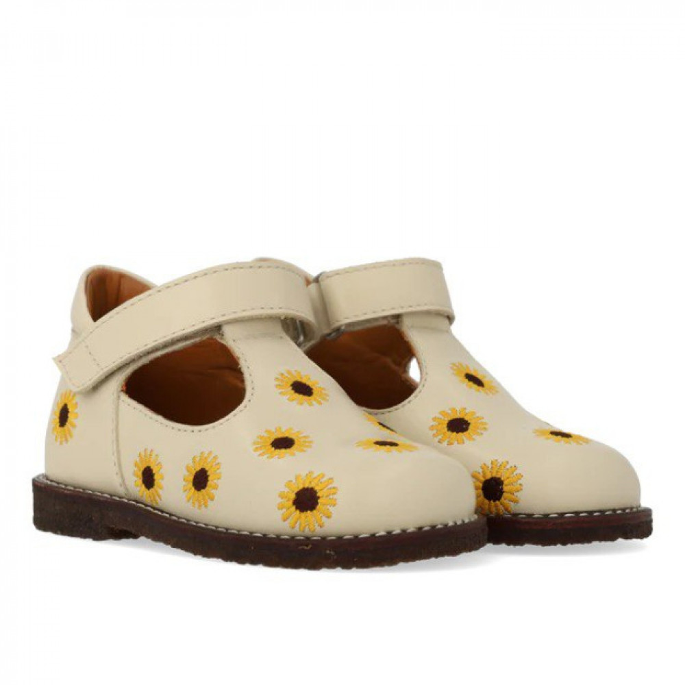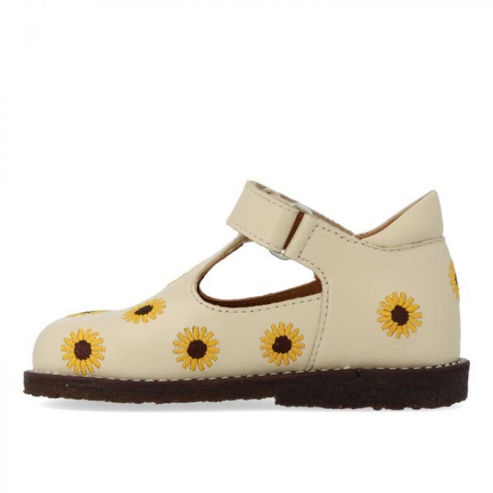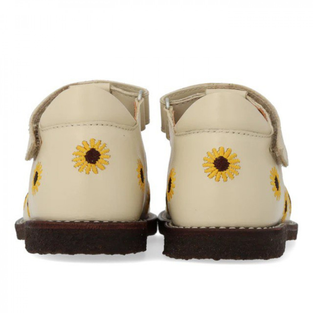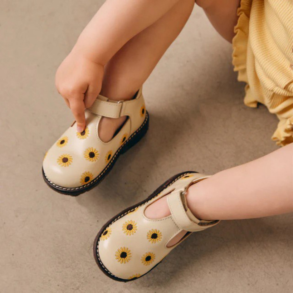 Класична Мері Джейн для початківців зі шкіри з вишивкою соняшника. Mary Jane має Т-подібний ремінець і регульований ремінь на липучці, фіксований каблук із м’яким коміром для додаткового комфорту, стабільності та підтримки, м’яку устілку, шкіряну підкладку без хрому та легку, м’яку та гнучку темно-коричневу відновлювану підошву з натурального каучуку, прикрашену декоративними контрастними швами. Виготовлений з натуральної дихаючої шкіри. Розроблено в Данії та виготовлено вручну з любов’ю в Португалії. Завжди вимірюйте стопу дитини перед покупкою, щоб переконатися, що ви підібрали правильний розмір. Ми рекомендуємо припуск 1 см.