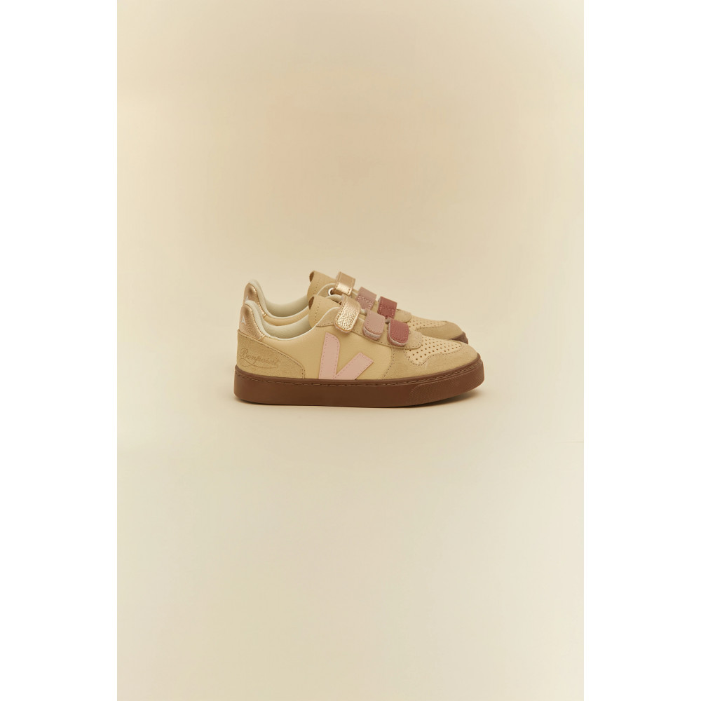 Ці кросівки V10 Bonpoint x Veja стануть незамінним завершальним штрихом для повсякденного образу. Ці м’які шкіряні туфлі мають контрастний логотип V на верху, а перфоровані носки забезпечують повітропроникність. Дизайн вирізняється оригінальним поєднанням матеріалів, включаючи замшу та зернисту шкіру, а також трьома ремінцями на липучках різних тонів. Органічна шкіра Закруглений носок Три ремінці на липучках Логотип Bonpoint ззаду Контрастна підошва