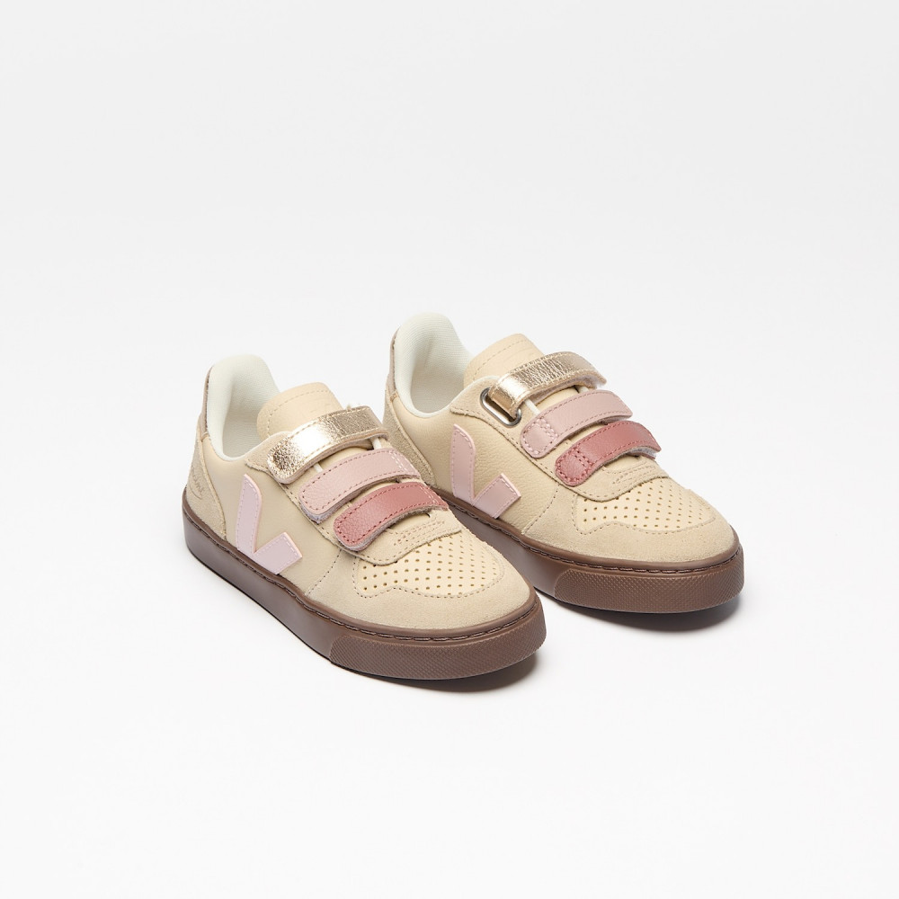 Ці кросівки V10 Bonpoint x Veja стануть незамінним завершальним штрихом для повсякденного образу. Ці м’які шкіряні туфлі мають контрастний логотип V на верху, а перфоровані носки забезпечують повітропроникність. Дизайн вирізняється оригінальним поєднанням матеріалів, включаючи замшу та зернисту шкіру, а також трьома ремінцями на липучках різних тонів. Органічна шкіра Закруглений носок Три ремінці на липучках Логотип Bonpoint ззаду Контрастна підошва