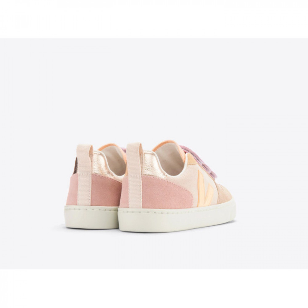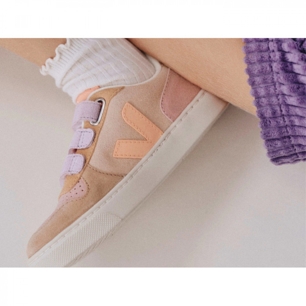 Модель V-10, виготовлена з поєднання екологічно чистих і стійких матеріалів, символізує 10 років кохання. Замша – це нижня частина шкіри, відшлі фована, щоб надати їй м’якості та гладкості. Він походить із ферм у регіоні Ріу-Гранді-ду-Сул і дубиться в Бразилії без шкідливих або заборонених хімікатів. VEJA використовує барвники, які відповідають нормам, і надає пріоритет відповідальному використанню води під час процесу засмаги. Потім цю замшу покривають водовідштовхувальними маслами, що не містять ПФУщоб захистити кросівки від легкого дощу.