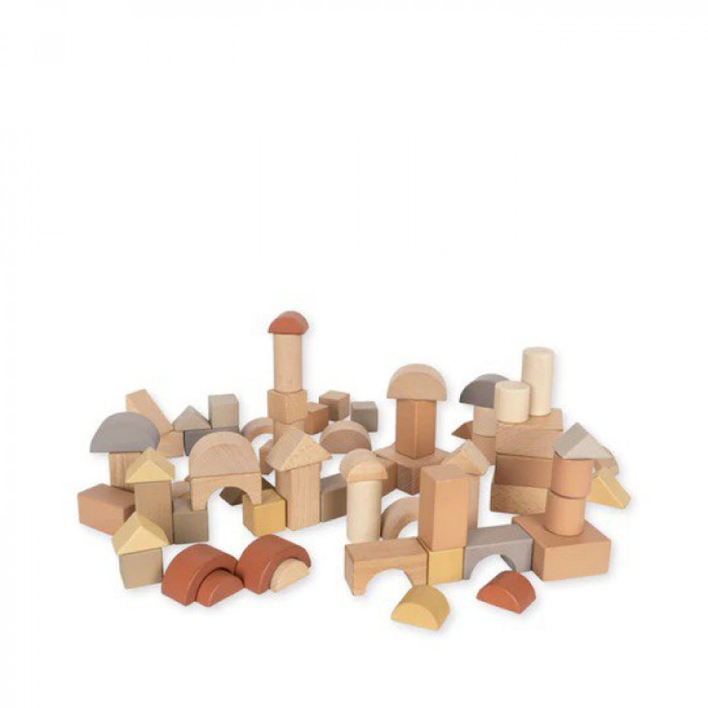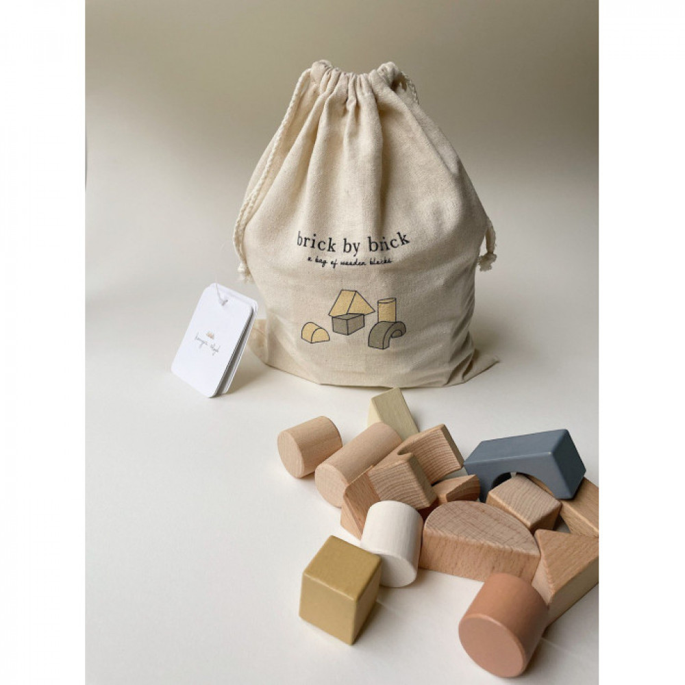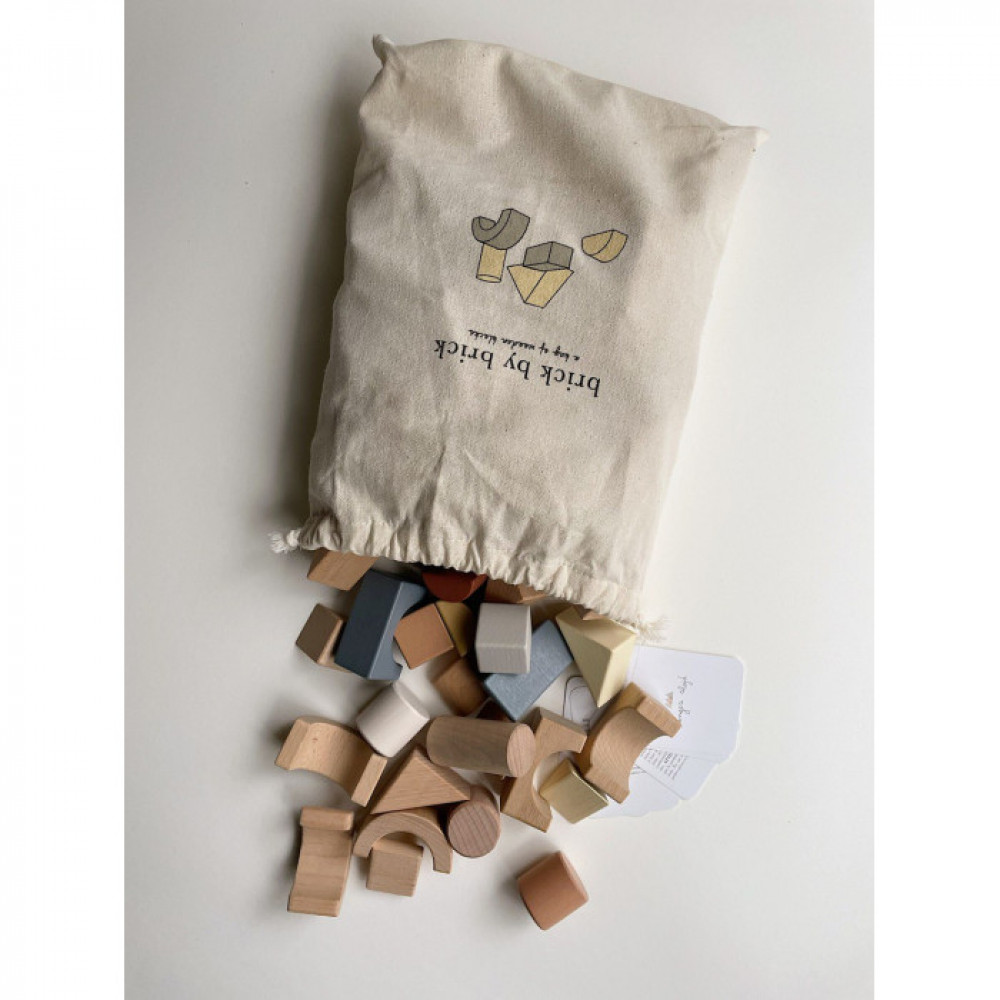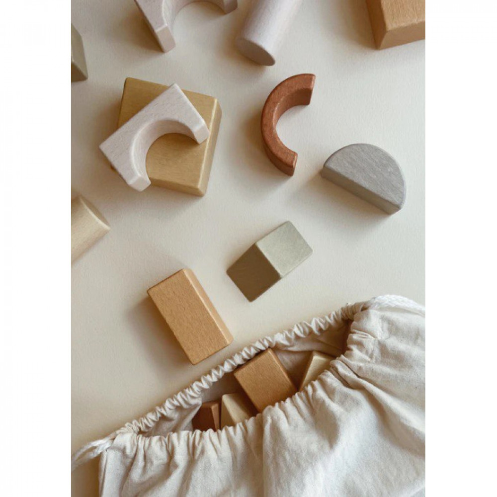 72 блоки з бука різної форми, пофарбовані фарбою на водній основі. Поставляється в бавовняній полотняній сумці на шнурках, яку зручно носити.