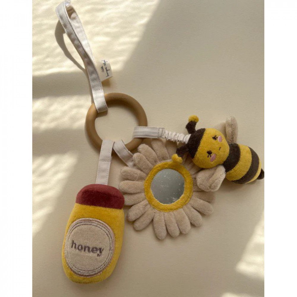 Кільце трімач виготовлен на 100 відсотків із силікону, безпечний для жування немовлятами. Кільце має ремінці з органічної бавовни з доданими м’якими фігурками, виготовлені з органічної бавовни з переробленим поліестеровим наповнювачем усередині. Одна фігурка містить пластикове дзеркало, а дві фігурки видають ніжний дзвін. Кільце також має ремінь для підвішування іграшки.