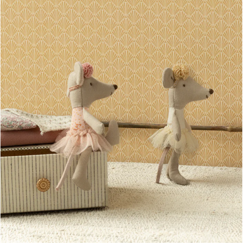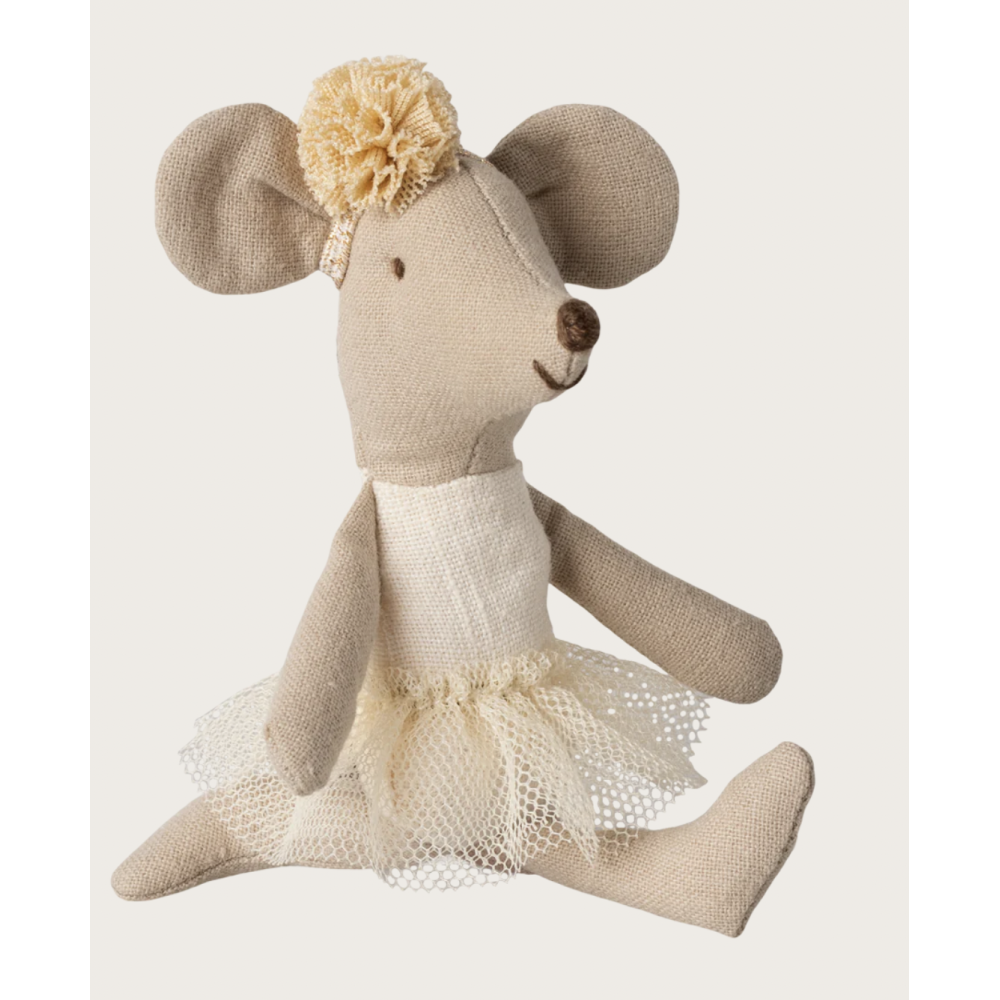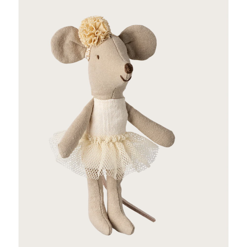 Маленька сестричка-мишка, одягнена як граціозна балерина. На ній гарна білосніжна пачка та гарна пов'язка на голову — готова до годин танців.