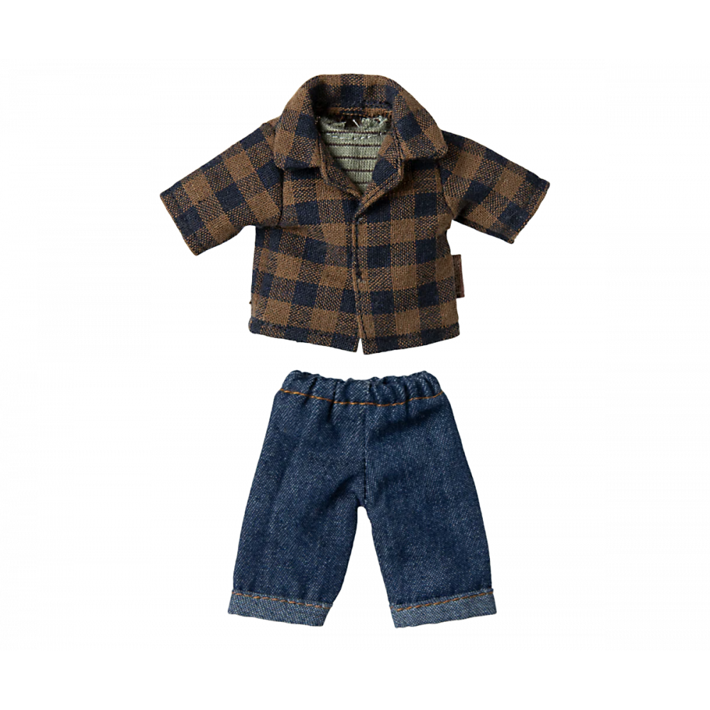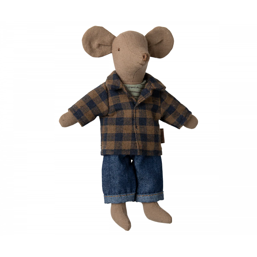 Тато-миша зі світло-коричневої тканини. Він одягнений у картату сорочку, майку та джинсові штани. Ця мишка підходить для меблів та аксесуарів розміру "миша". Купуйте більше одягу окремо, одяг розміру "мама/тато" підійде цій мишці. Розміри Зріст: 15.00 см, Вага нетто: 0.02 кг