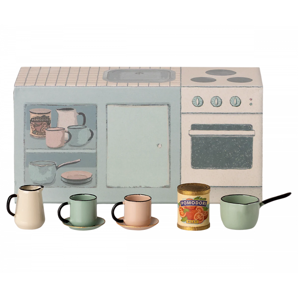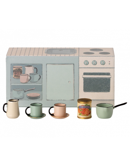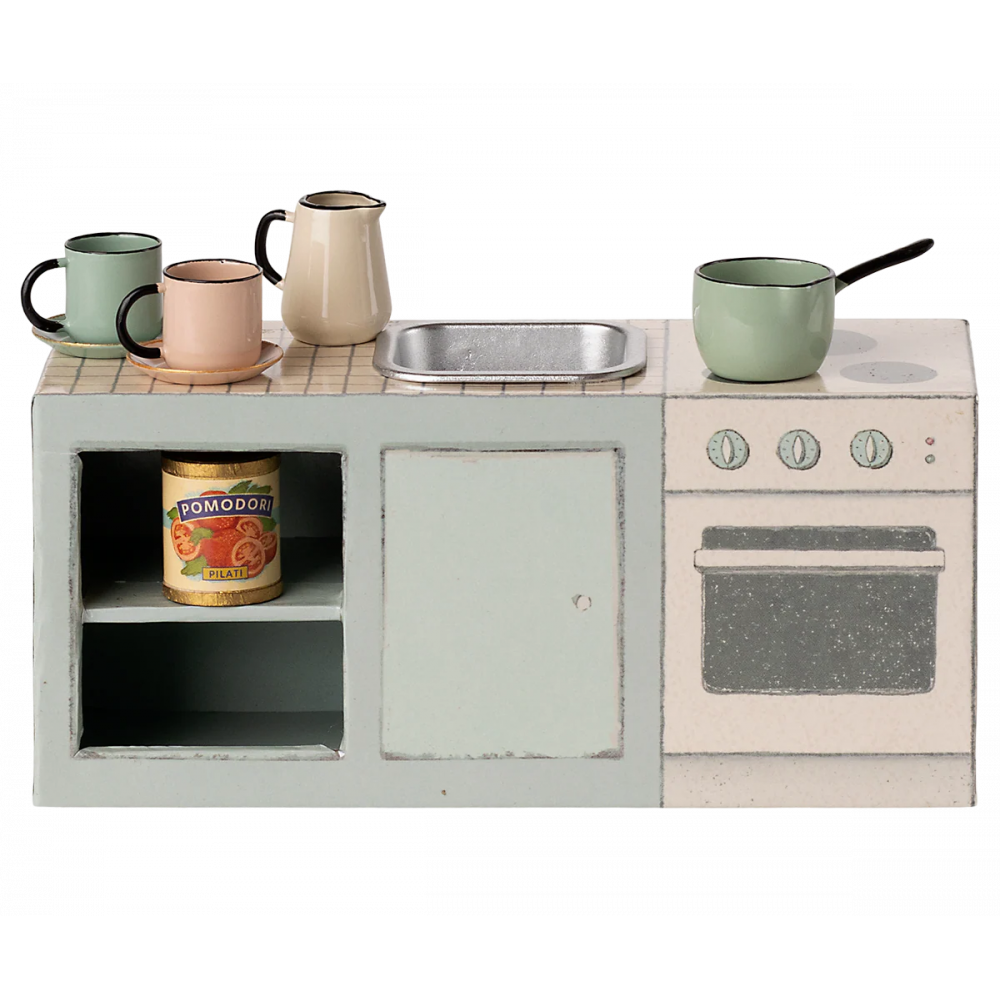 Невелика кухонна стільниця постачається з 2 чашками та 2 тарілками, каструлею, глечиком та невеликою банкою. Невелика раковина виготовлена з металу, щоб виглядати максимально реалістично. Вона ідеально вписується в кухню в мишачому будиночку SuitCasa. Висота: 6,00 см, Ширина: 13,00 см, Глибина: 4,50 см, Вага нетто: 0,09 кг