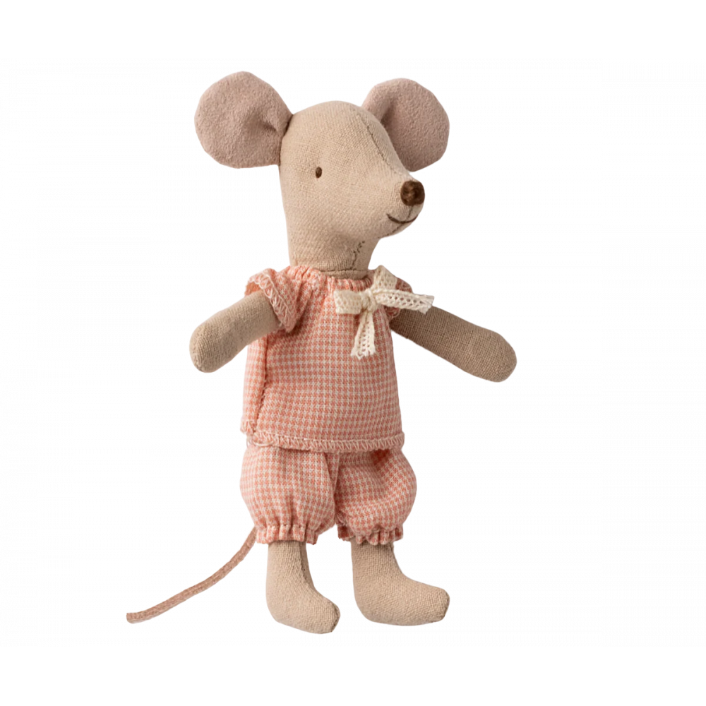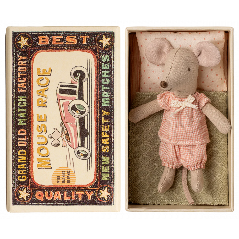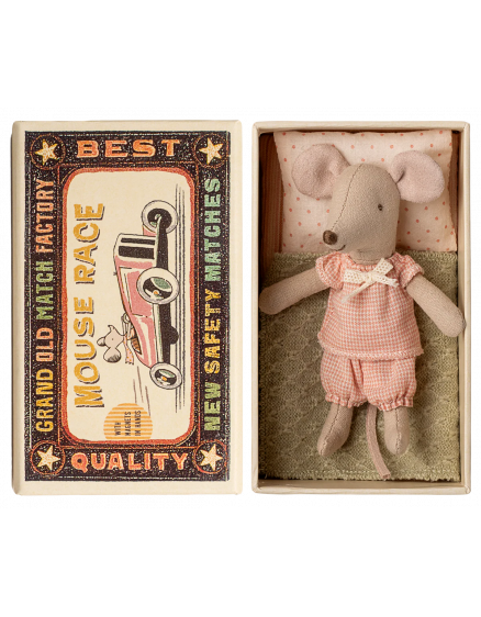 Класичний виріб від Maileg, ця мишка готова до годин гри та міцно спить у своїй маленькій сірниковій коробці. Одяг та постільна білизна виготовлені з м'яких тканин з унікальними принтами в красивих кольорах. У руках мишки є магніти. Висота: 11,3 см, вага нетто: 0,22 фунта