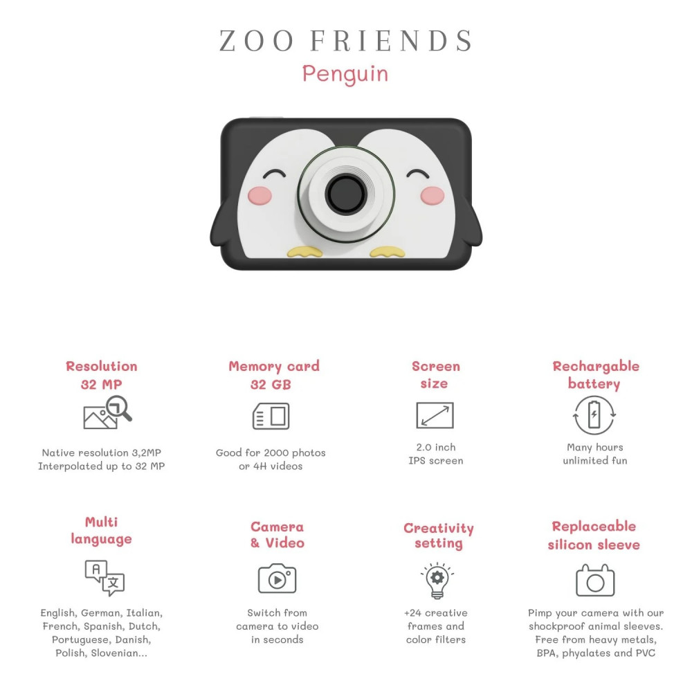 Персоналізуйте дитячу камеру за допомогою наліпок і навіть понад 20 цифрових фільтрів і рамок для камер. Силіконовий чохол без ПВХ, фталатів та екологічно чистий матеріал не тільки милий, але й захищає від падінь, зберігає камеру чистою, а також його можна легко зняти та помити. Завдяки вбудованому акумулятору, він може працювати годинами, перш ніж потрібно буде заряджати камеру. Повністю заряджений, він може зробити понад 2000 фотографій або записувати близько 4 годин. Камери Zoofamily підходять для дітей віком від 3 до 10 років і старше. Не забувайте, що купуючи дитячу камеру від Zoofamily, ми садимо дерево! Ідеальний подарунок для всіх дітей! 3,2-мегапіксельна дитяча цифрова камера (інтерпольована 32-мегапіксельна) Вік від 3 до 7 років. Розмір камери: 7,9 x 4,6 x 2,1 см Дисплей: 2 дюйми Відео та камера в одному. Легка, проста у використанні та міцна. Понад 20 кумедних фоторамок та наліпок. Карта пам'яті на 32 ГБ у комплекті, достатньо для 2000 фотографій або 4-годинних відео. Акумуляторна батарея ємністю 1000 мАг. До 2 годин безперервного використання. Знімний силіконовий чохол для кращого захисту та безпеки. Ударостійка та міцна. Багатомовна.