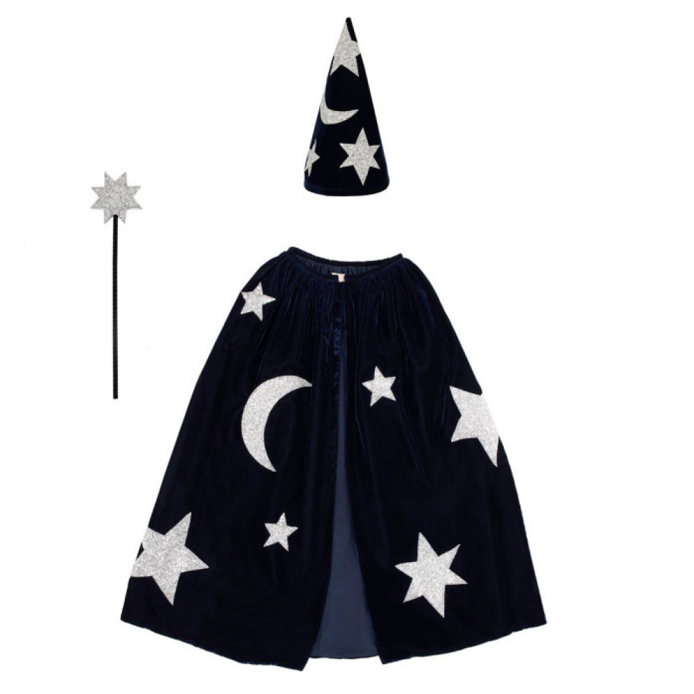 Поєднання розкішного блакитного оксамиту зі сріблястими блискучими тканинними зірками та місяцями робить цей костюм дуже особливим. Просто оберніться навколо накидки, надіньте капелюх і помахайте паличкою із зіркою, щоб за лічені секунди виглядати як чарівник. Він ідеально підходить для вечірок або для творчої гри.