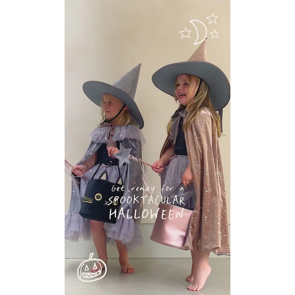Представляємо нашу чудову нову оксамитову накидку відьми «Грізельда»! Дійсно особливе доповнення до нашої колекції одягу на Хелловін цього сезону! Поєднайте її з нашим капелюхом, чарівною паличкою або пачкою відьми «Грізельда» для найгарнішого костюма маленької відьми, який ви коли-небудь бачили! Розмір підходить для дітей віком від 3 до 10 років Надзвичайно м’який сірий оксамит, прикрашений сузір’ями рожево-золотих зірок, з тюлевим коміром та спідницею, а також надзвичайно м’яким атласним бантом та підкладкою Застібка на ґудзики Перевірено на безпеку Тільки чистити протиранням Довжина накидки приблизно 73 см Попередження! Не підходить для дітей віком до 36 місяців