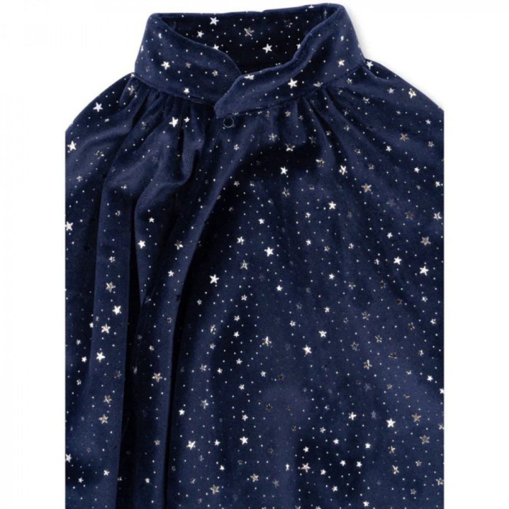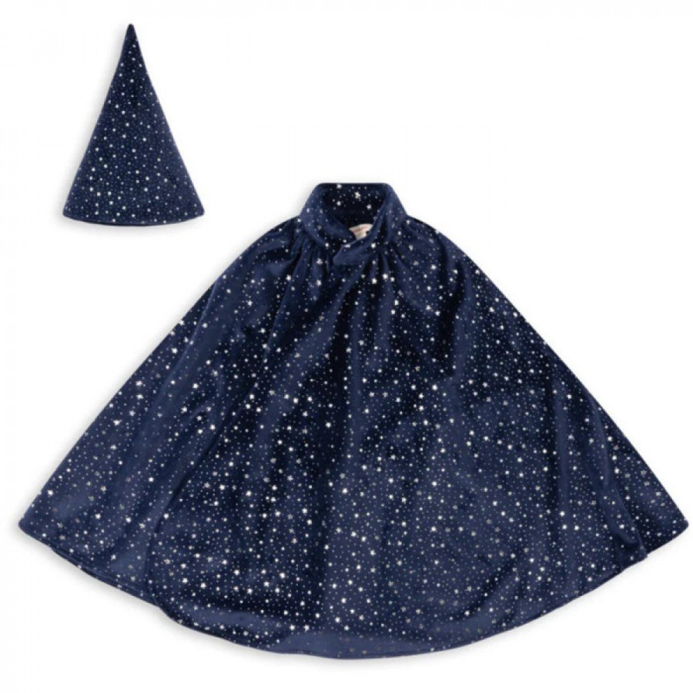 Фокус-покус! Наш костюм чарівника виготовлений з м’якого оксамиту, має накидку та капелюшок із зірковим принтом.