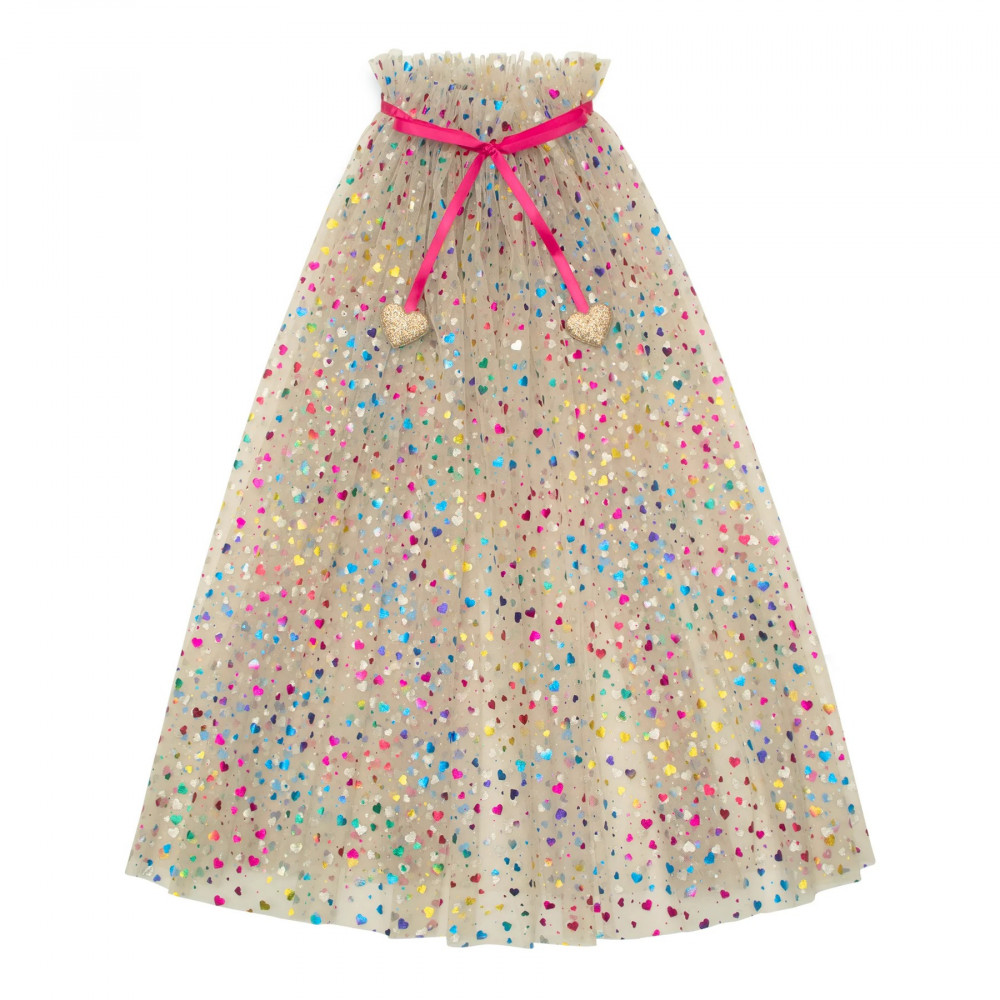 Пориньте у світ чудес з цією чудовою накидкою з райдужними сердечками! Шари м'якого тюлю, розкидані різнокольоровими сердечками, обов'язково ловитимуть світло з кожним обертанням! Шари м'якого нейтрального тюлю, розкидані різнокольоровими райдужними металевими сердечками Застібка на ґудзики з атласною стрічкою та золотими блискітками у формі сердечок Розмір: підходить для дітей віком 3-10 років Тільки протирати Перевірено на безпеку Довжина приблизно 76 см Увага! Не підходить для дітей віком до 36 місяців