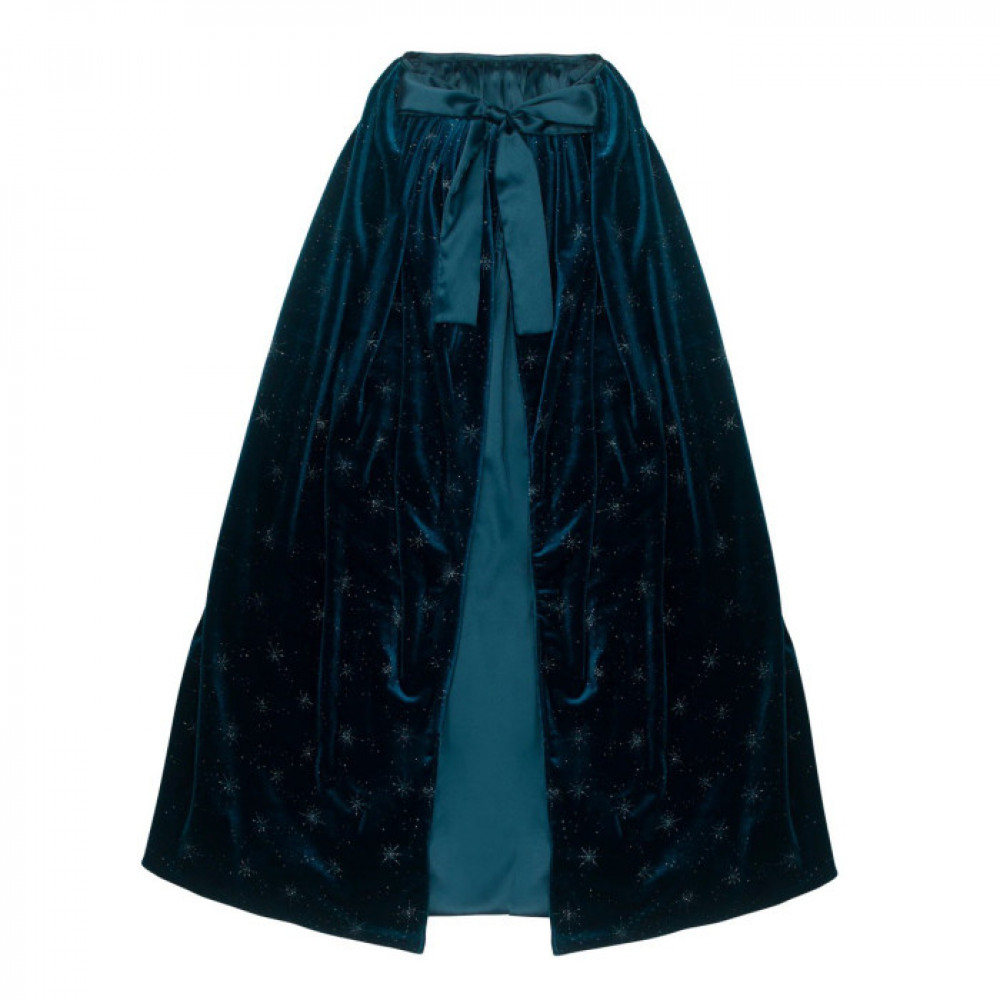 Для всіх маленьких бажаючих стати чарівниками та чарівницями! Ця чарівна та таємнича накидка, виготовлена з найрозкішнішого бірюзового оксамиту та прикрашена сузір’ями срібних зірок, ідеально підходить для вечірок у костюмах, костюмованих вечірок або Хелловіна! Тільки протирати. Довжина накидки становить приблизно 70 см.