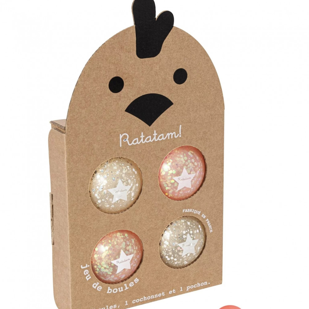 Гра в бочче Ratatam для веселих барвистих ігор! Петанк ще ніколи не був таким веселим, як наш набір м'ячів для петанку для дітей! Виготовлений у Франції з якісних матеріалів, наш набір для гри в петанк поставляється в бавовняній сумці, щоб зробити його літньою зіркою. Це набір шарів для петанку, який ви купуєте своїм дітям, але з радістю позичите для оригінальної гри в петанк між дорослими. 4 кульки з блиском або бульбашками або літні кулі з ПВХ Доступний у 4 різних кольорах: золоті та срібні блискітки, блакитні та рожеві блискітки, літній багатобарвний та срібні та рожеві бульбашки Флуоресцентний рожевий Джек Бавовняна сумка в комплекті для зручності перенесення гри Набір розроблений, виготовлений і зібраний у Франції Міцні матеріали для нескінченних ігор у петанк. Вага - 0,515 кг Розміри - 27 × 20 см